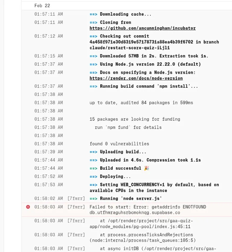 A friend asked what this cost to “vibe.” There was something usable from the start — I just kept making it more complicated. I have a paid Claude account; building the app used maybe 5% of my weekly allowance. The API credit for AI-generated questions: 45p. Render hosting: 11p (plus $19/month for the Professional plan — the free tier only allows one service, and I suspect I’ll be deploying more). Supabase: free.